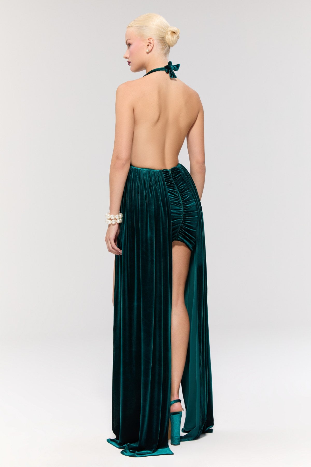 Elbise, yeşil kadife kumaş, mini boyu ile modern ve şık bir silüet sunar.