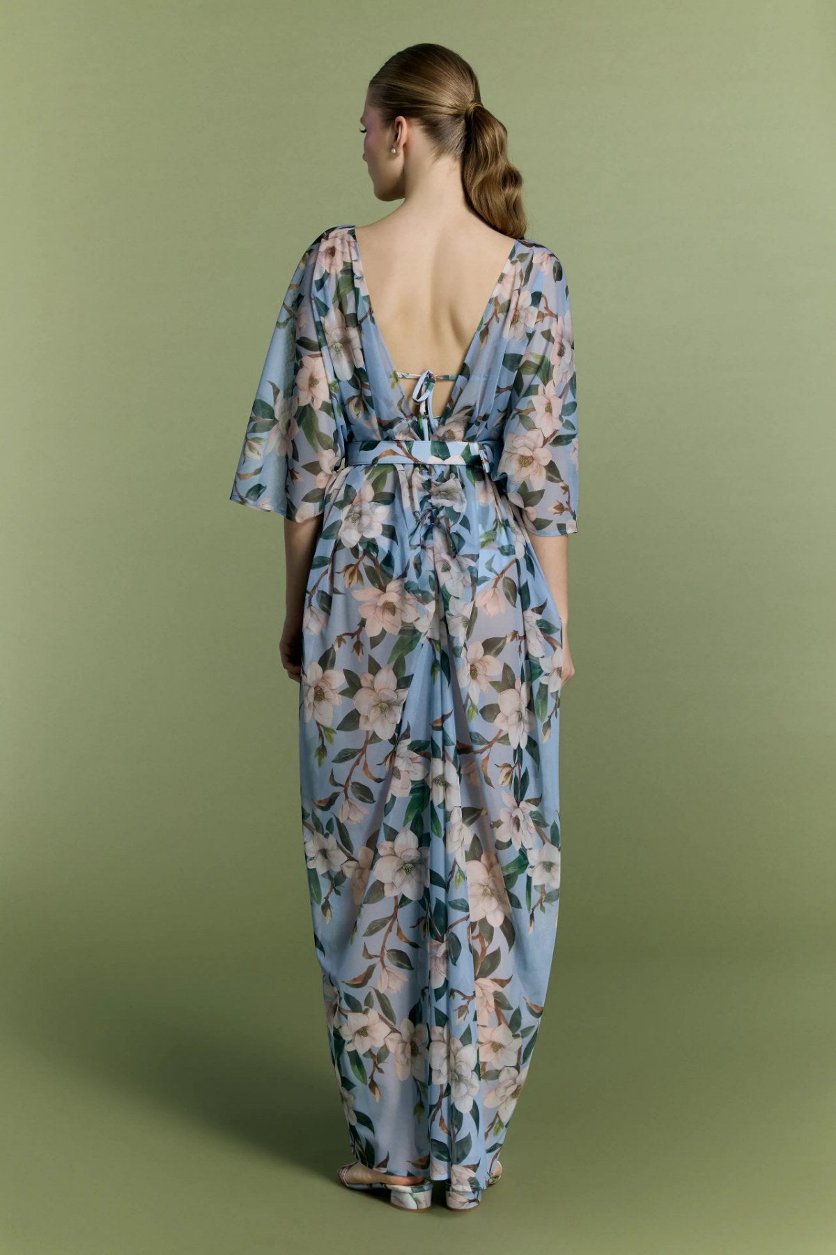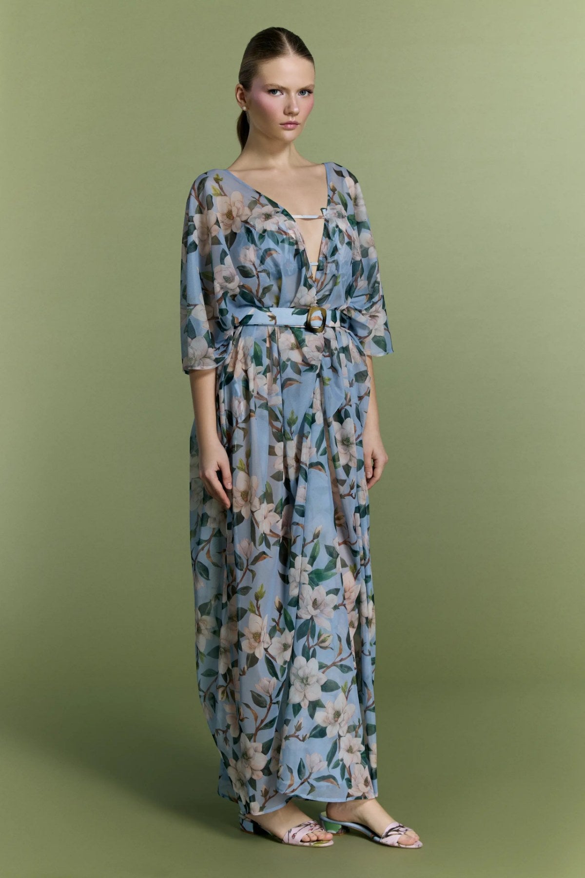 Zarif ve modern çizgileri buluşturan bu tasarım, mavi tonlarda çiçek desenli kumaşıyla feminen bir tatil stili sunuyor.