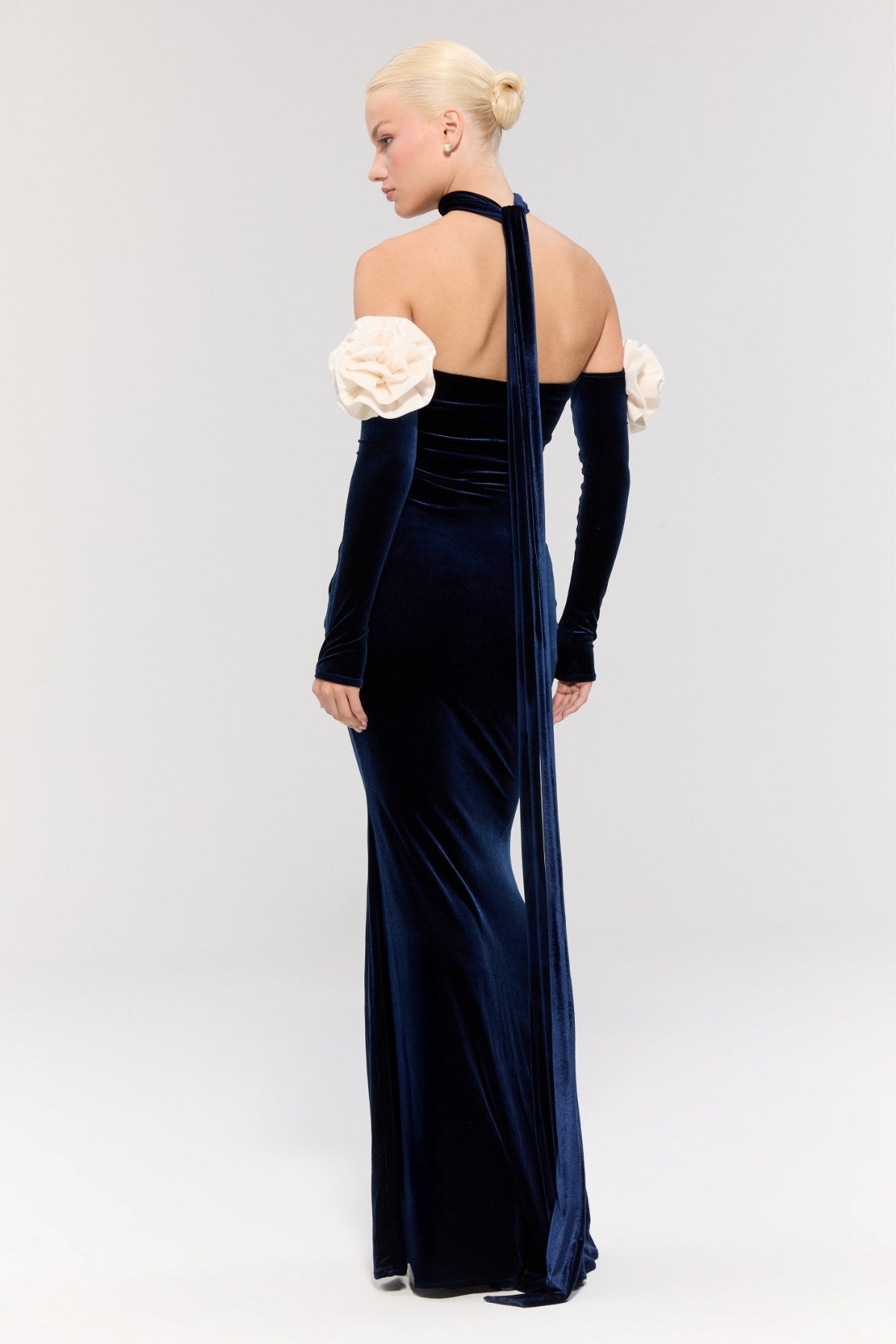 Elbise, lacivert kadife dokusuyla sofistike bir görünüm sunarken, balık model kesimi zarif bir silüet oluşturur.