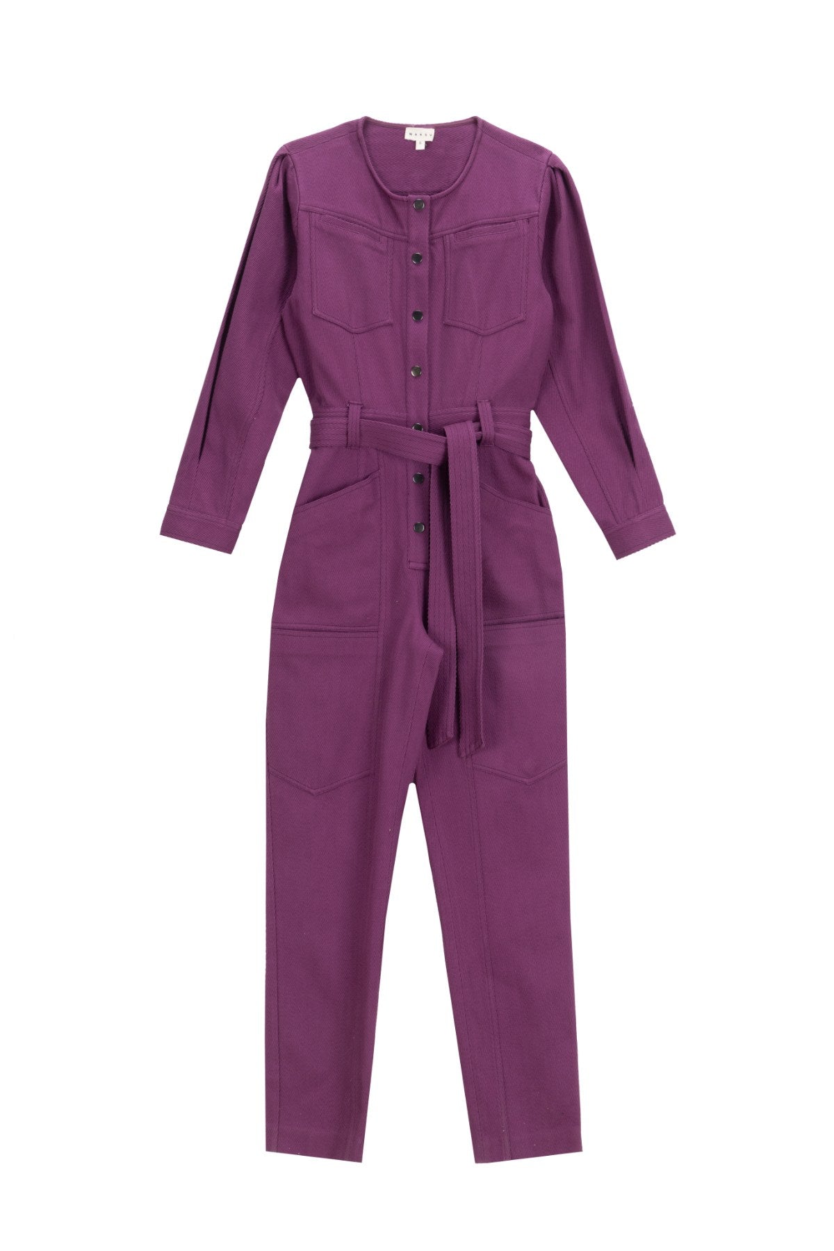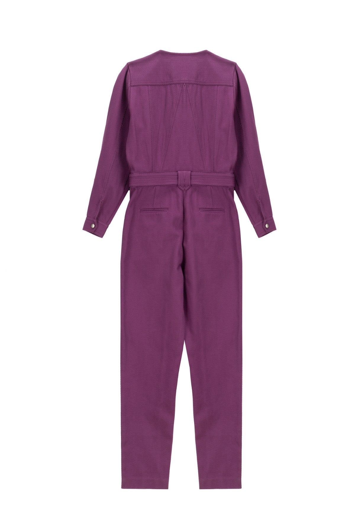 Mürdüm tonlarında, omuz detayı açık, bacak kısmı dökümlü, zarif ve şık bir tulum modelidir. Üretim yeri: Türkiye.