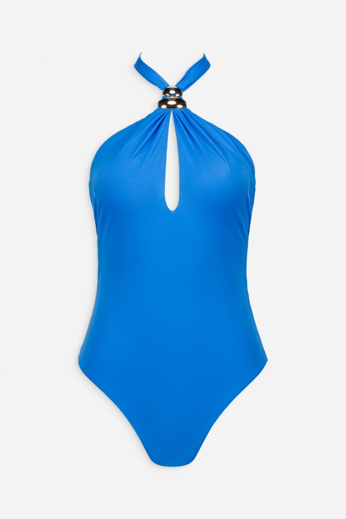 Altın ve gümüş kaplama detaylı, damla dekolteli halter yaka mayo. ** Maliluha ürünleri olağanüstü çekicilik ve stil ile birleşerek, kaliteli kumaşlar kullanarak yüksek işçilikle elde dikilir.